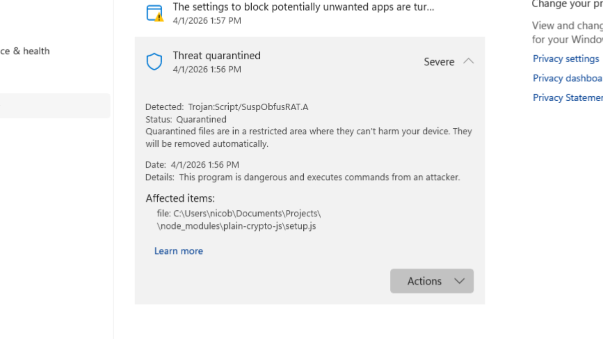 So there I was, running yarn install on April 1, 2026 at 1:56 PM GMT+8. Yarn was still pulling packages when Windows Defender popped up with the detection.
